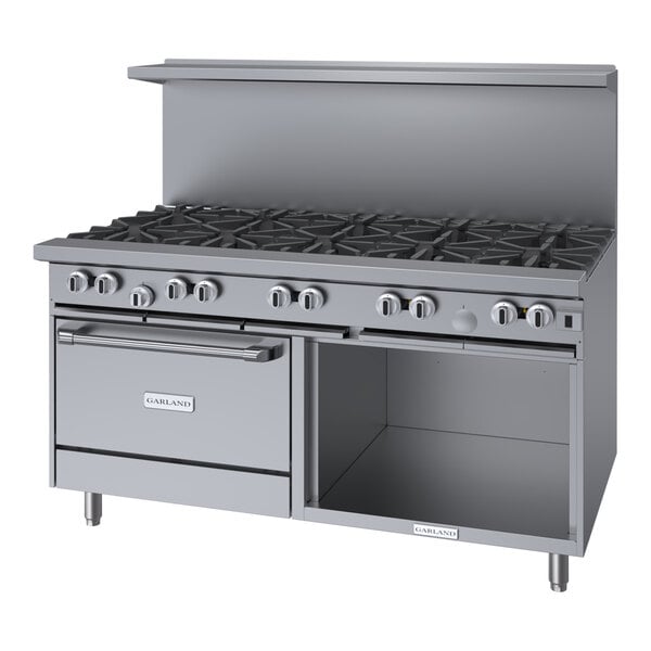 The 60" wide Garland G60-10CS liquid propane ten burner range with convection oven and storage base comes packed with features that enhance its convenience and usability. Ten powerful 30,000 BTU Starfire-Pro burners are set in split cast iron ergonomic grates. Its convection oven base is designed for even baking and high performance and boasts three adjustable oven racks. With its 27" deep cooking area and 5" deep front ledge, this range also has the largest usable cooking surface in the industry!