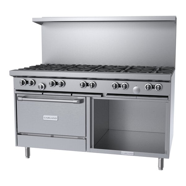 The Garland G60-10RS natural gas ten burner range with a standard oven and storage base comes packed with features that enhance its convenience and usability. Ten powerful 33,000 BTU Starfire-Pro burners are set in split cast iron ergonomic grates.