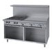 This model's 36" griddle is made of 5/8" thick steel and features a wide range of temperature settings, delivering 18,000 BTUs of cooking power for every 12" section (54,000 BTU). The griddle's high splash guards and a 4 1/4" grease trough provide optimum runoff control. Equipped with 4 Starfire-Pro 30,000 BTU burners, this range's cast iron grates allow you to easily slide heavy pots from one section to another, while protected individual burner pilots eliminate spillover outages.