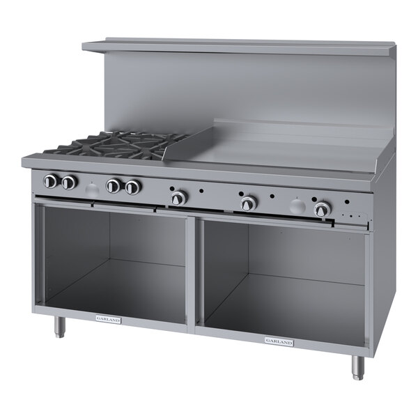 Quickly cook meats, vegetables, and more with this Garland G60-4G36SS natural gas 4 burner 60" range with 36" griddle top and 2 storage bases! With a 27 1/4" deep cooking area, 21" top shelf, and 5" deep front ledge, this range has the largest usable cooking surface in the industry to provide you with top-of-the-line cooking performance every time!