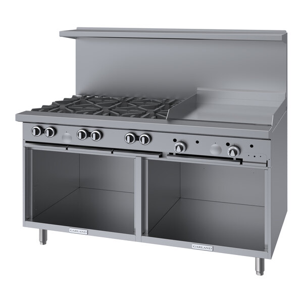 Featuring 6 Starfire-Pro 30,000 BTU burners, this Garland G60-6G24SS liquid propane 60" range with 24" griddle top and 2 storage bases provides you with top-of-the-line cooking performance every time! With a 27 1/4" deep cooking area, 21" top shelf, and 5" deep front ledge, this range has the largest usable cooking surface in the industry. Its cast iron grates allow you to easily slide heavy pots from one section to another, while protected individual burner pilots eliminate spillover outages.