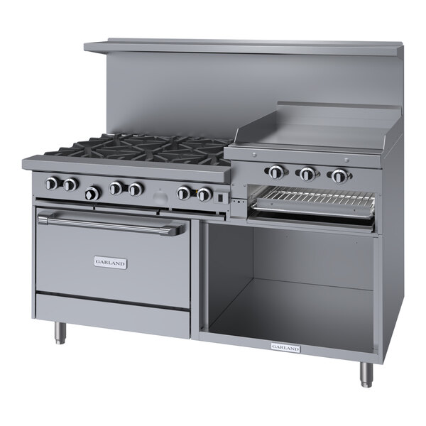 Garland G60-6R24CS Natural Gas 6 Burner 60" Range with 24" Raised Griddle / Broiler, Convection Oven, and Storage Base - 269,000 BTU