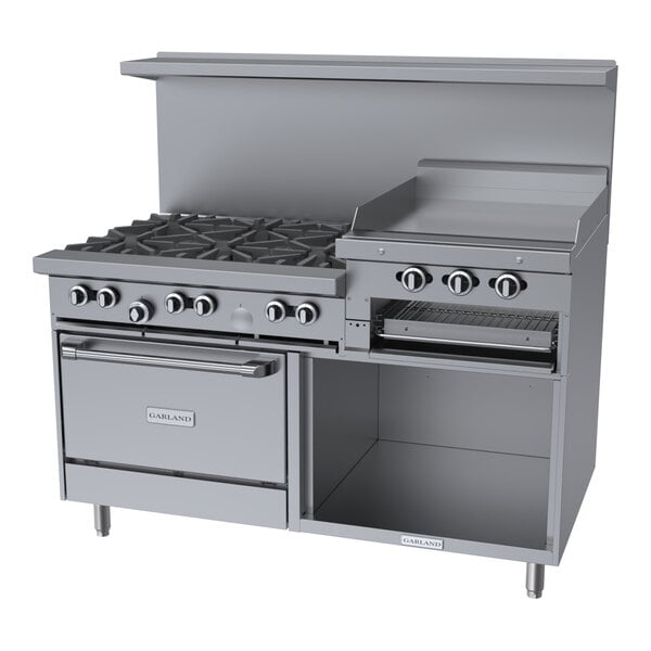 The Garland G60-6R24RS natural gas six burner range with a 24" raised griddle/broiler, standard oven, and storage base comes packed with features that enhance its convenience and usability. Six powerful 33,000 BTU Starfire-Pro burners are set in split cast iron ergonomic grates.