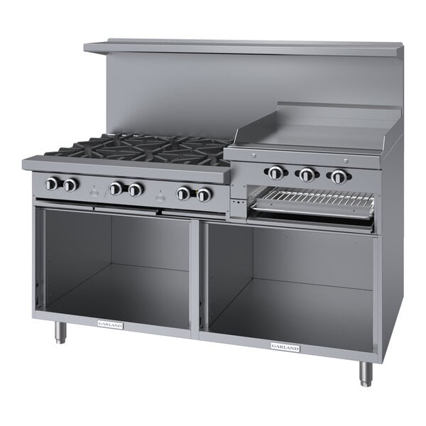 Featuring 30,000 BTU Starfire-Pro burners, the Garland G60-6R24SS liquid propane 60" range with 24" raised griddle / broiler and 2 storage bases provides you with top-of-the-line cooking performance every time! With its 27 1/4" deep cooking area and 5" deep front ledge, this range also has the largest usable cooking surface in the industry!