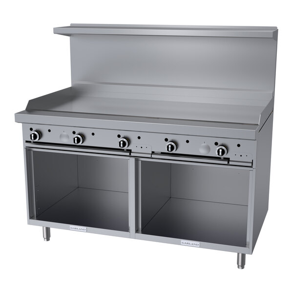Quickly cook meats, vegetables, and more with this Garland G60-G60SS liquid propane 60" range with 60" griddle top and 2 storage bases! This model's 60" griddle is made of 5/8" thick steel and features a wide range of temperature settings, delivering 18,000 BTUs of cooking power for every 12" section (90,000 BTU total). The griddle's high splash guards and a 4 1/4" grease trough provide optimum runoff control. With a 27 1/4" deep cooking area, 21" top shelf, and 5" deep front ledge, this range has the largest usable cooking surface in the industry to provide you with top-of-the-line cooking performance every time!