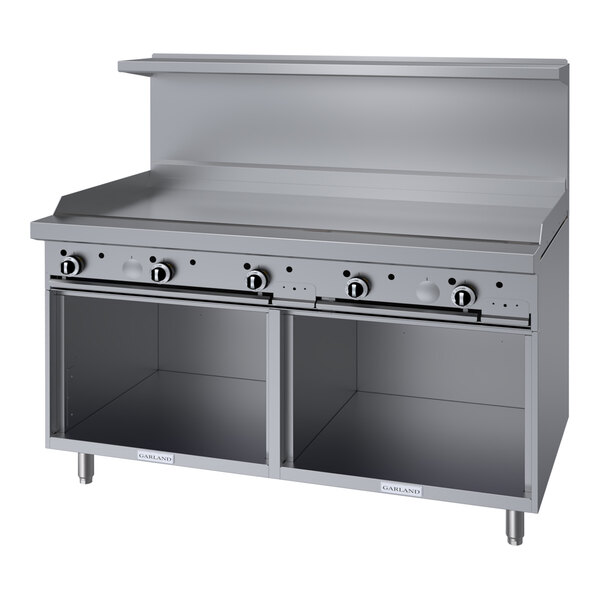 Quickly cook meats, vegetables, and more with this Garland G60-G60SS natural gas 60" range with 60" griddle top and 2 storage bases! This model's 60" griddle is made of 5/8" thick steel and features a wide range of temperature settings, delivering 18,000 BTUs of cooking power for every 12" section (90,000 BTU total). The griddle's high splash guards and a 4 1/4" grease trough provide optimum runoff control. With a 27 1/4" deep cooking area, 21" top shelf, and 5" deep front ledge, this range has the largest usable cooking surface in the industry to provide you with top-of-the-line cooking performance every time!
