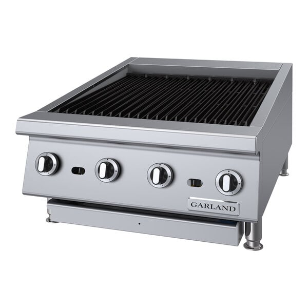 The Garland GTBG24-NR24 24" radiant charbroiler features a sturdy, welded frame, and stainless steel front, sides, top trim, and landing ledge. 4" adjustable stainless steel legs are standard.