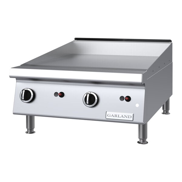 The heavy-duty Garland GTGG24-G24M liquid propane griddle provides 54,000 BTU of cooking power across its 24" width to handle any cooking task! This griddle has a chrome plate that ensures higher heat retention and easier cleaning than standard steel griddle plates. It prevents sticking, browning, and flavor transfer, yielding a higher quality product overall. Great for eggs cooked sunny side up, fish, or fluffy pancakes, the chrome plate makes sure that these delicate foods won't stick or tear.