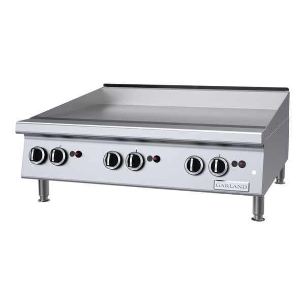 The heavy-duty Garland GTGG36-GT36M liquid propane griddle provides 84,000 BTU of cooking power across its 36" width to handle any cooking task! This griddle has a chrome plate that ensures higher heat retention and easier cleaning than standard steel griddle plates. It prevents sticking, browning, and flavor transfer, yielding a higher quality product overall. Great for eggs cooked sunny side up, fish, or fluffy pancakes, the chrome plate makes sure that these delicate foods won't stick or tear.