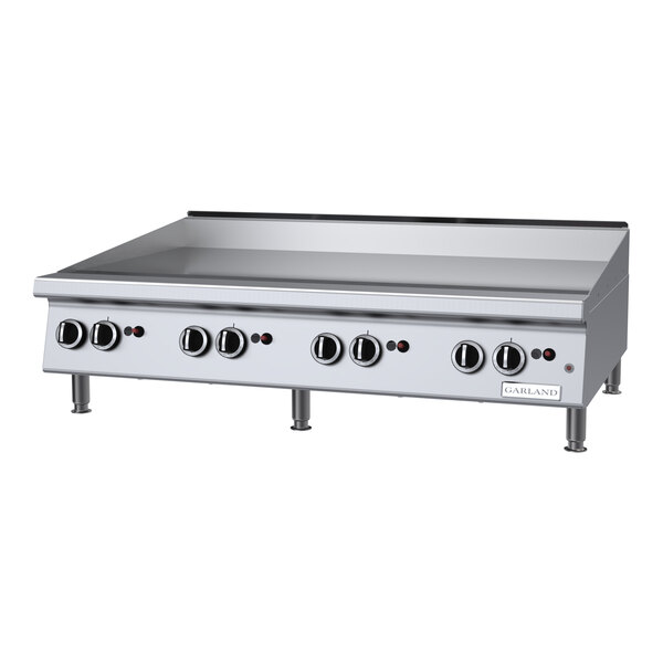 The heavy-duty Garland GTGG48-GT48M liquid propane griddle provides 112,000 BTU of cooking power across its 48" width to handle any cooking task! This griddle has a chrome plate that ensures higher heat retention and easier cleaning than standard steel griddle plates. It prevents sticking, browning, and flavor transfer, yielding a higher quality product overall. Great for eggs cooked sunny side up, fish, or fluffy pancakes, the chrome plate makes sure that these delicate foods won't stick or tear.