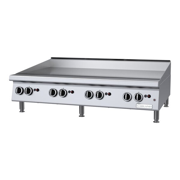 The heavy-duty Garland GTGG48-GT48M natural gas griddle provides 112,000 BTU of cooking power across its 48" width to handle any cooking task! This griddle has a chrome plate that ensures higher heat retention and easier cleaning than standard steel griddle plates. It prevents sticking, browning, and flavor transfer, yielding a higher quality product overall. Great for eggs cooked sunny side up, fish, or fluffy pancakes, the chrome plate makes sure that these delicate foods won't stick or tear.