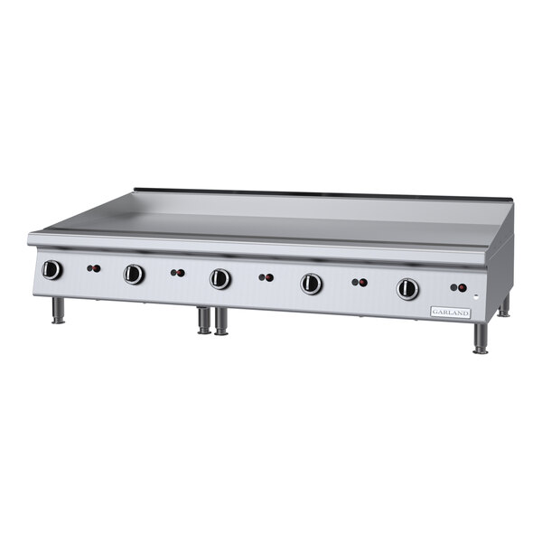 The heavy-duty Garland GTGG60-G60M natural gas griddle provides 135,000 BTU of cooking power across its 60" width to handle any cooking task! This griddle has a chrome plate that ensures higher heat retention and easier cleaning than standard steel griddle plates. It prevents sticking, browning, and flavor transfer, yielding a higher quality product overall. Great for eggs cooked sunny side up, fish, or fluffy pancakes, the chrome plate makes sure that these delicate foods won't stick or tear.