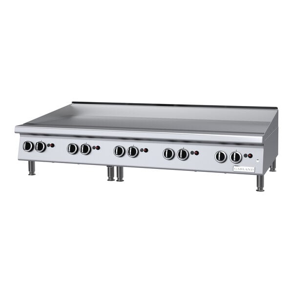 The heavy-duty Garland GTGG60-GT60M liquid propane chrome griddle provides 140,000 BTU of cooking power across its 60" width to handle high volume cooking tasks! This griddle has a chrome plate that ensures higher heat retention and easier cleaning than standard steel griddle plates. It prevents sticking, browning, and flavor transfer, yielding a higher quality product overall. Great for eggs cooked sunny side up, fish, or fluffy pancakes, the chrome plate ensure that these delicate foods won't stick or tear.
