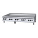 This 60" wide heavy-duty gas griddle features five "U" shaped, 28,000 BTU burners for powerful, even cooking. Its thermostatic controls enable precise temperature adjustment from 200-550 degrees Fahrenheit. The Piezo ignition ensures reliable lighting at the beginning of each shift.