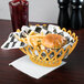 Serve hot wings, hot dogs, burgers and fries, sandwiches, and more with the tropical yellow GET OB-940-TY oval plastic fast food basket! Its playful, contemporary pattern and vibrant color choices are sure to help your featured entrees or sandwiches stand out.