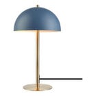 - Matte brass base and arm with matte blue mid-century, modern mushroom shade