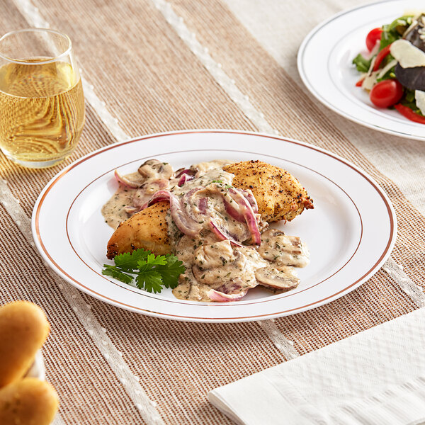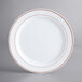 Featuring a classic rose gold band pattern along the wide outer rim, this plate's contrast between rim and stark white body is sure to draw attention while adding an upscale look to your wedding receptions, banquets, or other catered events.