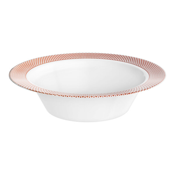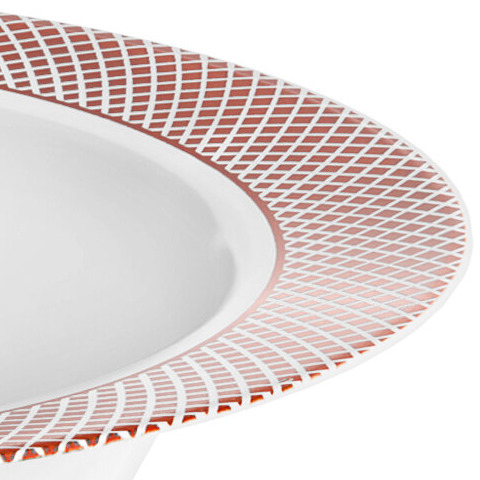 Featuring a contemporary rose gold lattice pattern along the wide outer rim, this bowl's contrast between rim and body is sure to draw attention while adding an upscale look to your wedding receptions, banquets, or other catered events.