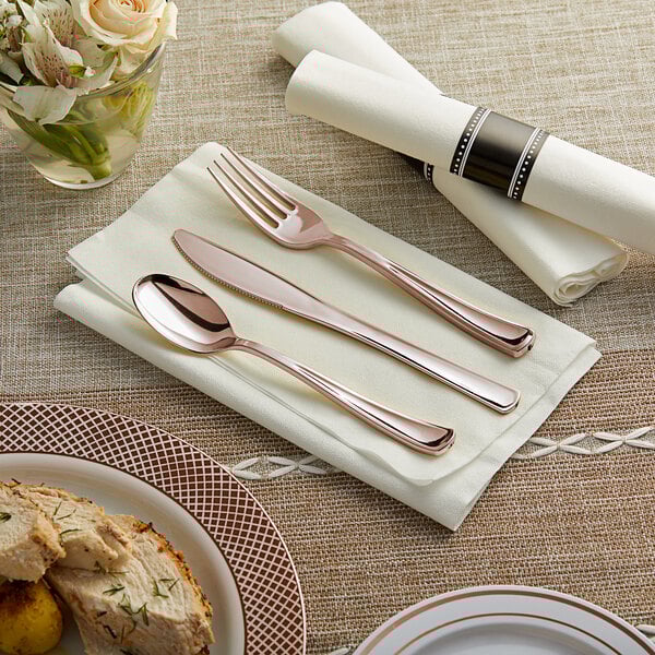 Elevate your serving and display presentation with this Visions 18" x 15 1/2" pre-rolled linen-feel white napkin and Classic extra heavy weight rose gold plastic cutlery set!