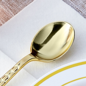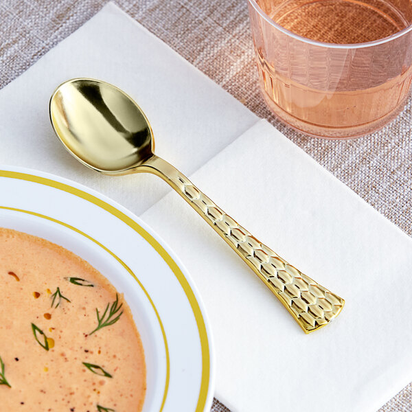 The shiny gold finish and elegant handle also give this plastic spoon the appearance of regular silverware. With this Visions 5 7/8" heavy weight plastic soup spoon, you can provide the perfect elegant dining environment at weddings, parties, and catered events, without the upscale flatware price.