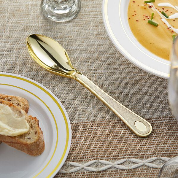 The elegant, glossy gold finish and ornate, vintage style also give this plastic spoon the appearance of regular silverware. With this Visions extra heavy weight plastic spoon, you can provide the perfect elegant dining environment at weddings, parties, and catered events, without the upscale flatware price.