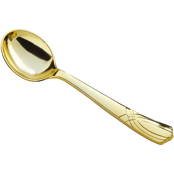 The shiny gold finish and elegant handle also gives this plastic spoon the appearance of regular silverware. With this Visions Skyline 6" extra heavy weight plastic soup spoon, you can provide the perfect elegant dining environment at weddings, parties, and catered events, without the upscale flatware price.