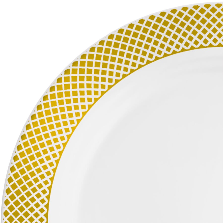 A traditional gold lattice pattern along the wide outer rim serves as a striking contrast to the stark white body of this plate. It's sure to draw attention while adding an upscale look to your wedding receptions, banquets, or other catered events.