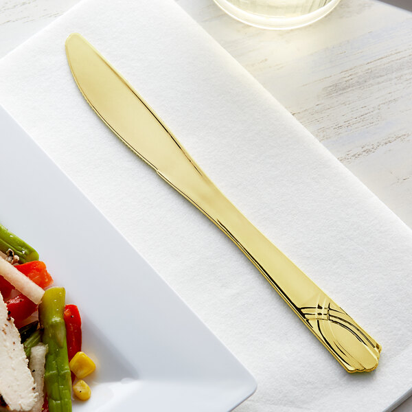 Featuring the look of a gold-plated knife at a fraction of the cost, this Visions Skyline knife is the ideal flatware for a variety of applications. Because this flatware is disposable, you won't have to waste any extra time washing large quantities of dishes. Easily add this knife to the place settings at your banquet, party, or other catered event!