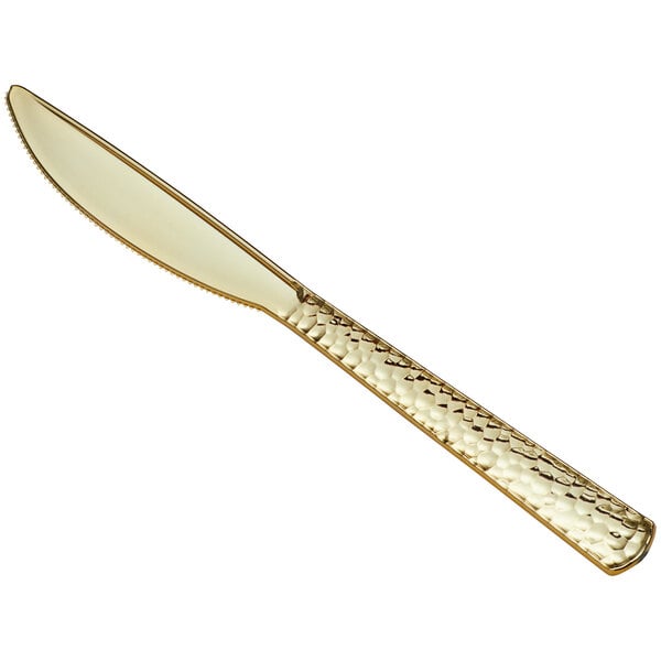 Featuring the look of a gold-plated knife at a fraction of the cost, this Visions Hammered knife is the ideal flatware for a variety of applications. Because this flatware is disposable, you won't have to waste any extra time washing large quantities of dishes. In addition, there is no longer any worrying about losing money due to expensive silverware accidentally being thrown away!