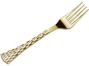 The elegant, glossy gold finish and unique honeycomb pattern gives this plastic fork the appearance of regular silverware. With this Visions heavy weight plastic fork, you can provide the perfect elegant dining environment at weddings, parties, and catered events, without the upscale flatware price.