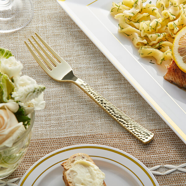 The elegant, glossy gold finish and unique hammered finish also gives this plastic fork the appearance of regular silverware. With this extra heavy weight plastic fork, you can provide the perfect elegant dining environment at weddings, parties, and catered events, without the upscale flatware price.