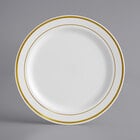 Featuring a classic gold band pattern along the wide outer rim, this plate's contrast between rim and bone / ivory body is sure to draw attention while adding an upscale look to your wedding receptions, banquets, or other catered events.