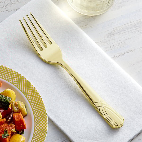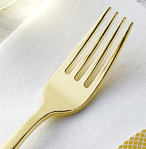 The shiny gold finish and elegant handle also gives this plastic fork the appearance of regular silverware. With this Visions Skyline 7" extra heavy weight plastic fork, you can provide the perfect elegant dining environment at weddings, parties, and catered events, without the upscale flatware price.