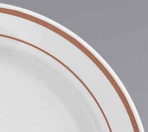 Featuring a contemporary rose gold band pattern along the wide outer rim, this plate's striking contrast between rim and stark white body is sure to draw attention while adding an upscale look to your wedding receptions, banquets, or other catered events.