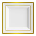 By ordering this Visions Halo sample, you're able to touch and see it in person to ensure it meets all the unique requirements of your foodservice space before committing to the purchase of a full case. Serve your signature appetizers, salads, and entrees on an elegant dish without any of the cleanup with this Visions Halo 8" square white plastic plate with gold bands! This plate's contemporary, square shape maximizes serving space while its wide rim helps to contain oils, dressings, and sauces to prevent accidental messes and spills. Featuring a classic gold band pattern along the wide outer rim, this plate's contrast between rim and stark white body is sure to draw attention while adding an upscale look to your wedding receptions, banquets, or other catered events. This plate is designed to mimic the look of real china, while providing the convenience of disposability for quick and easy cleanup. Plus, the versatile 8" size is ideal for serving not only meat and potatoes, but salads, pasta, and sandwiches, too!