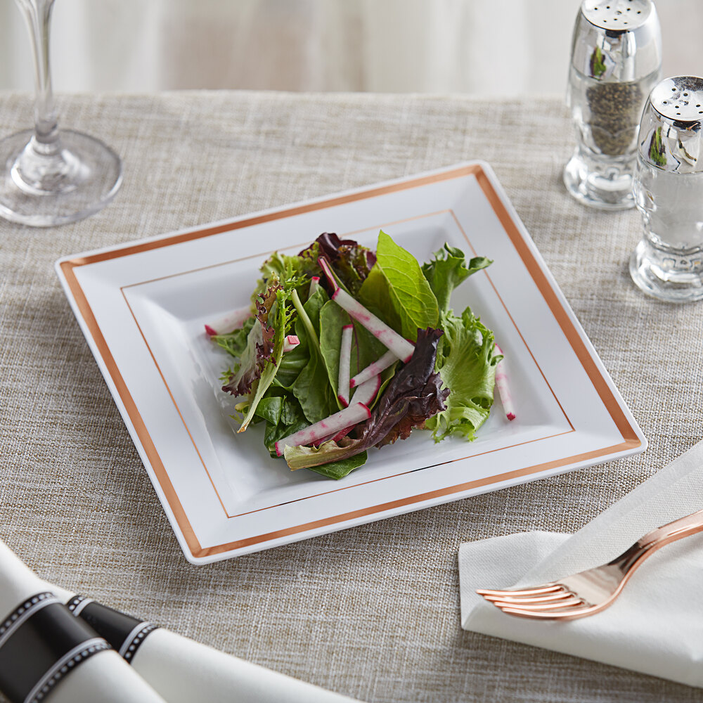 Visions 8" Square White Plastic Plate with Rose Gold / Copper Bands - 120/Case