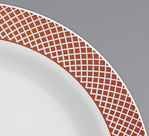 Featuring a contemporary rose gold lattice pattern along the wide outer rim, this plate's striking contrast between rim and stark white body is sure to draw attention while adding an upscale look to your wedding receptions, banquets, or other catered events.