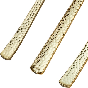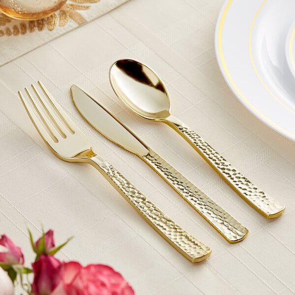 The lustrous gold mirror finish and distinctive hammered handle pattern add charming radiance and dimension to each piece, serving to further emulate the appearance of regular silverware. With this Visions extra heavy weight plastic cutlery set, you can provide an elegant dining atmosphere for any sophisticated event without the costliness of upscale flatware.