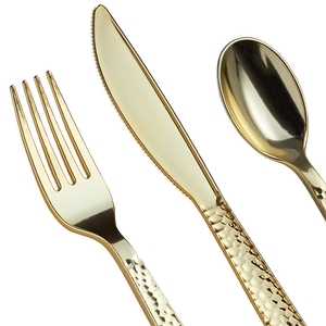 Featuring the look of gold tone cutlery at a fraction of the cost, this cutlery is ideal for adding flare to table settings for a variety of applications without breaking the budget. From weddings, to parties and catered events, this disposable flatware provides an elegant touch without the upscale price of costly cutlery. In addition, there is no longer any worrying about losing money due to expensive silverware accidentally being thrown away. This set includes (1) 7 1/4" fork, (1) 7 1/2" serrated edge knife, and (1) 6 3/4" spoon so your guests have everything they need to enjoy a meal.