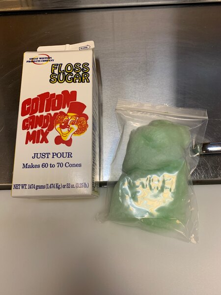 This sugar is one of our favorites just because of the pretty green color that it spins out into. We love to mix it with other colors and it tastes good too!