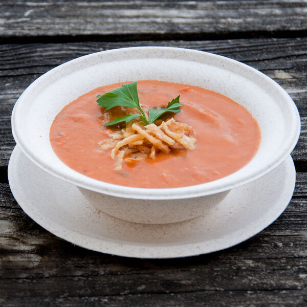 This Green Wave Ovation OV-P006 6” round plate will help cut down on landfill waste while reducing the amount of dishes to wash in your establishment. This product is made with a blend of sugarcane and wheat fibers, which are both renewable resources. Each plate features an eye-catching marble design and white color that will make your food stand out. This plate is also durable, so you can use it for hot or cold food without worrying about it leaking. It is even microwavable for easy reheating.