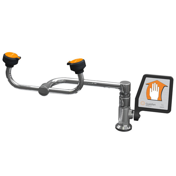 Reduce workplace injury and protect workers from irreparable harm with this Guardian Equipment G1806 deck mounted eyewash station! This useful add-on allows a standard hand sink to easily double as an emergency eyewash station. Designed for mounting on the counter to the right of your hand sink, the spray heads swivel 90 degrees from storage to operational position and are activated by the convenient flag handle.