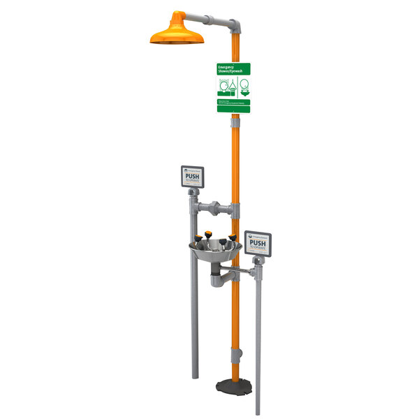 The shower head is 10" in diameter and has a 20 GPM flow control. The eyewash and shower each have their own respective hand paddles that when pressed will activate the flow of water for as long as they are engaged. The WideArea eye/face wash includes 4 GS-Plus spray heads for a wider area of flushing that covers both the eyes and the face. Each freeze-resistant spray head has a float-off dust cover and an internal flow control. This unit has a bottom mounted 1 1/4" NPT male supply inlet for the shower, a 3/4" NPT female inlet for the eyewash, and requires a 120V electrical connection for operation.