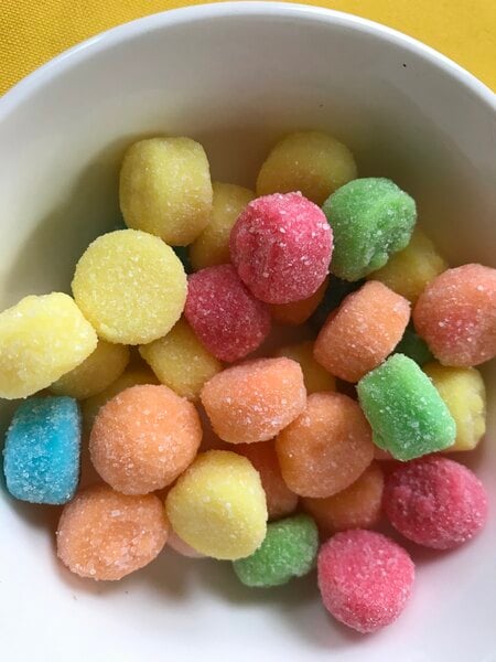 These are so yummy! They remind me of sour gummy worms but already in small pieces. Looks great on top of desserts and are soft.