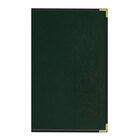 This menu cover boasts a sturdy interior construction, with black leatherette trimmed pockets and smooth gold corners to help hold your inserts in place. Plus, it features a padded vinyl exterior with a stylish green finish that is sure to impress your guests! It is easy to wipe down at the end of every shift, allowing you to give every guest the best possible dining experience. Use this menu cover to present your offerings in a refined and organized way!