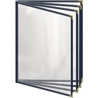 Present your menu offerings in style with this H. Risch, Inc. TE-10V Deluxe Sewn 8 1/2" x 14" blue 10 view vinyl menu cover with gold decorative corners and gloss finish! With a colorful leatherette trim, this menu cover promotes a professional appearance in any setting. Its five pockets accommodate ten 8 1/2" x 14" inserts, making it perfect for presenting your signature dishes, happy hour specials, wine lists, or dessert menus. Plus, if your menu changes frequently, the inserts can be removed and replaced within seconds.