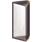 Present your menu offerings in style with this H. Risch, Inc. TE-12V Deluxe Sewn 4 1/4" x 11" black 12 view vinyl menu cover with gold decorative corners and gloss finish! With a colorful leatherette trim, this menu cover promotes a professional appearance in any setting. Its six pockets accommodate twelve 4 1/4" x 11" inserts, making it perfect for presenting your signature dishes, happy hour specials, wine lists, or dessert menus. Plus, if your menu changes frequently, the inserts can be removed and replaced within seconds.