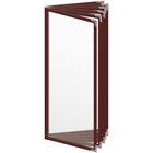 Present your menu offerings in style with this H. Risch, Inc. TE-12V Deluxe Sewn 4 1/4" x 11" brown 12 view vinyl menu cover with silver decorative corners and matte finish! With a colorful leatherette trim, this menu cover promotes a professional appearance in any setting. Its six pockets accommodate twelve 4 1/4" x 11" inserts, making it perfect for presenting your signature dishes, happy hour specials, wine lists, or dessert menus. Plus, if your menu changes frequently, the inserts can be removed and replaced within seconds.