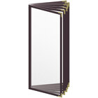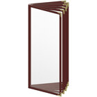 Present your menu offerings in style with this H. Risch, Inc. TE-12V Deluxe Sewn 4 1/4" x 11" red 12 view vinyl menu cover with gold decorative corners and matte finish! With a colorful leatherette trim, this menu cover promotes a professional appearance in any setting. Its six pockets accommodate twelve 4 1/4" x 11" inserts, making it perfect for presenting your signature dishes, happy hour specials, wine lists, or dessert menus. Plus, if your menu changes frequently, the inserts can be removed and replaced within seconds.