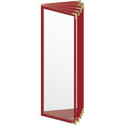 Present your menu offerings in style with this H. Risch, Inc. TE-12V Deluxe Sewn 4 1/4" x 14" maroon 12 view vinyl menu cover with gold smooth corners and matte finish! With a colorful leatherette trim, this menu cover promotes a professional appearance in any setting. Its six pockets accommodate twelve 4 1/4" x 14" inserts, making it perfect for presenting your signature dishes, happy hour specials, wine lists, or dessert menus. Plus, if your menu changes frequently, the inserts can be removed and replaced within seconds.